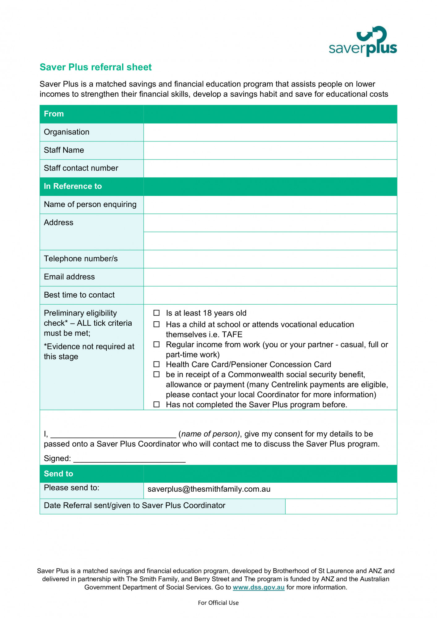 We have received valuable feedback from the community suggesting that a referral form would help connect parents and carers with the Saver Plus program more easily.