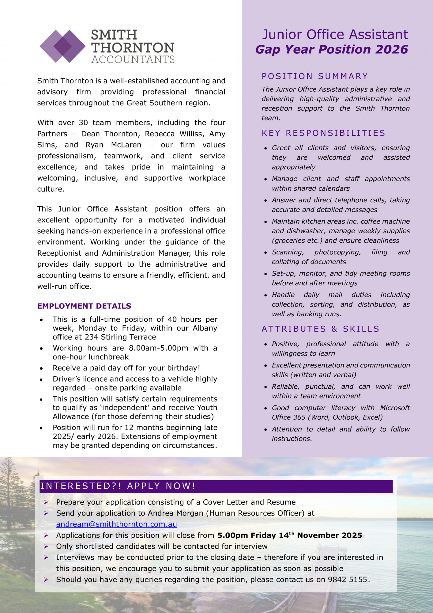 This opportunity is for a full-time, 12-month role as our Junior Office Assistant. Details about the role, employment conditions, and how to apply can be found on the attached flyer.