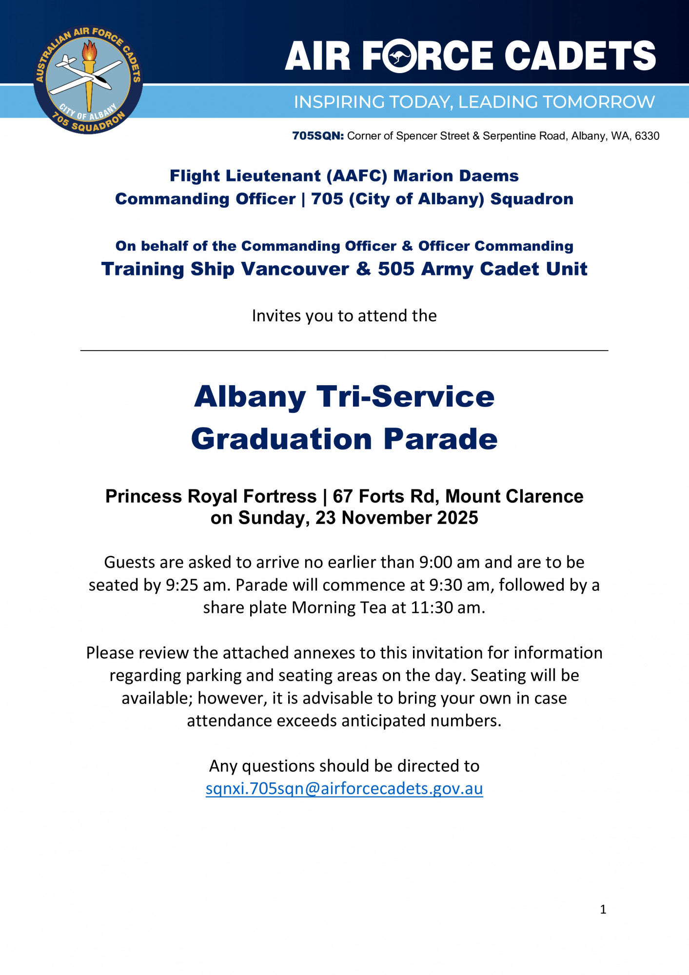 The Australian Air Force Cadets in Albany are now recruiting for February 2026. Attached is a poster with information about 705(City of Albany)SQN of the Australian Air Force Cadets.