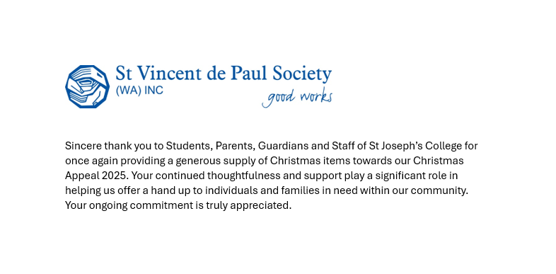 Sincere thank you to Students, Parents, Guardians and Staff of St Joseph’s College.