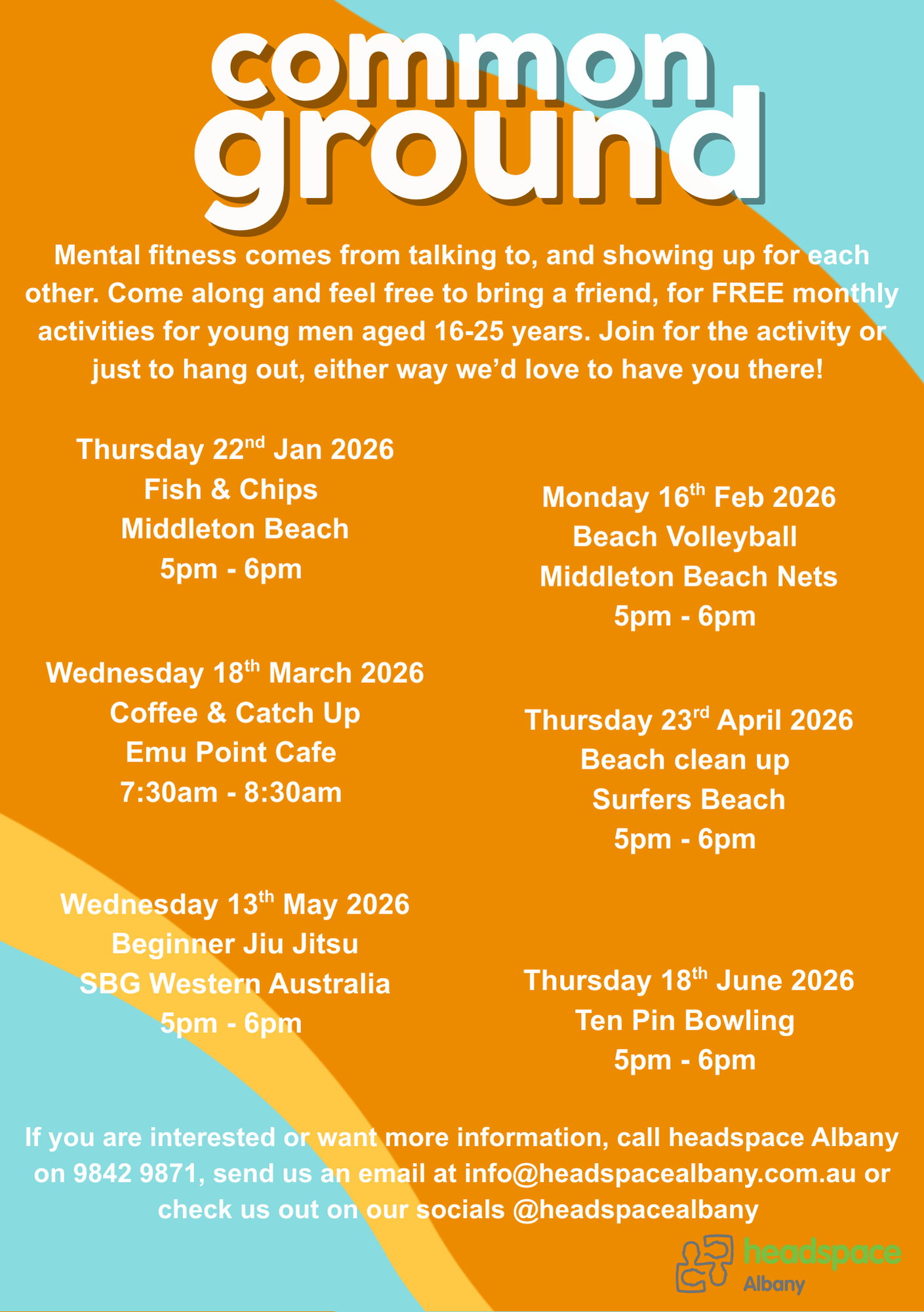 The 2026 activity schedule is posted at the headspace Albany centre, in community spaces around town (cafés, gyms, stores), on our Instagram & Facebook and website.