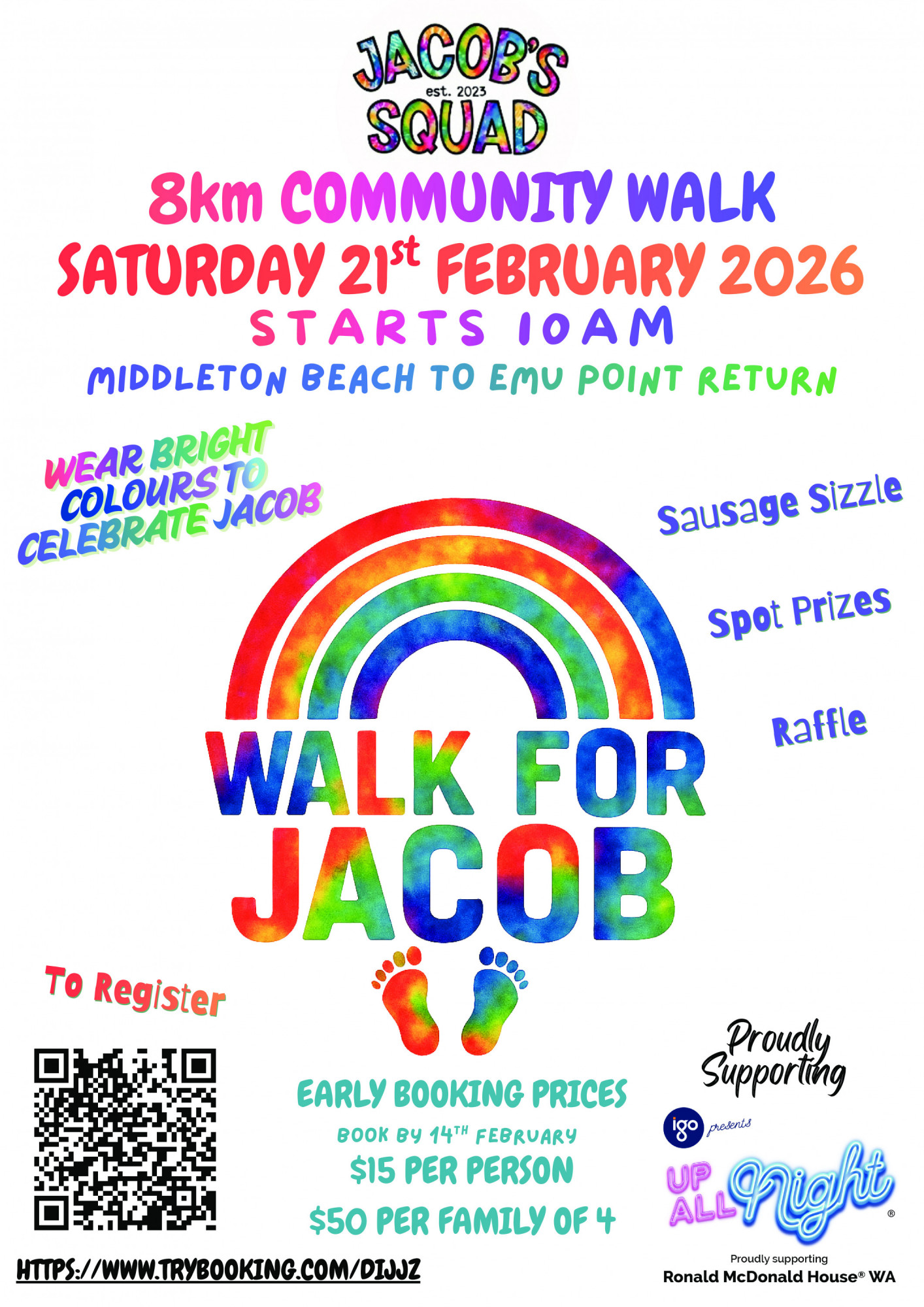 I’m getting in touch on behalf of the organising team for Walk for Jacob 2026, a community event raising funds for Ronald McDonald House Charity. This family-friendly event is being held in honour of Albany local Jacob Wills who lost his battle with High-Risk Neuroblastoma in June 2023. Jacob would have been part of the current 2026 Year 9 cohort, and I believe that there are students at all of your schools that went to Albany Primary School with Jacob.