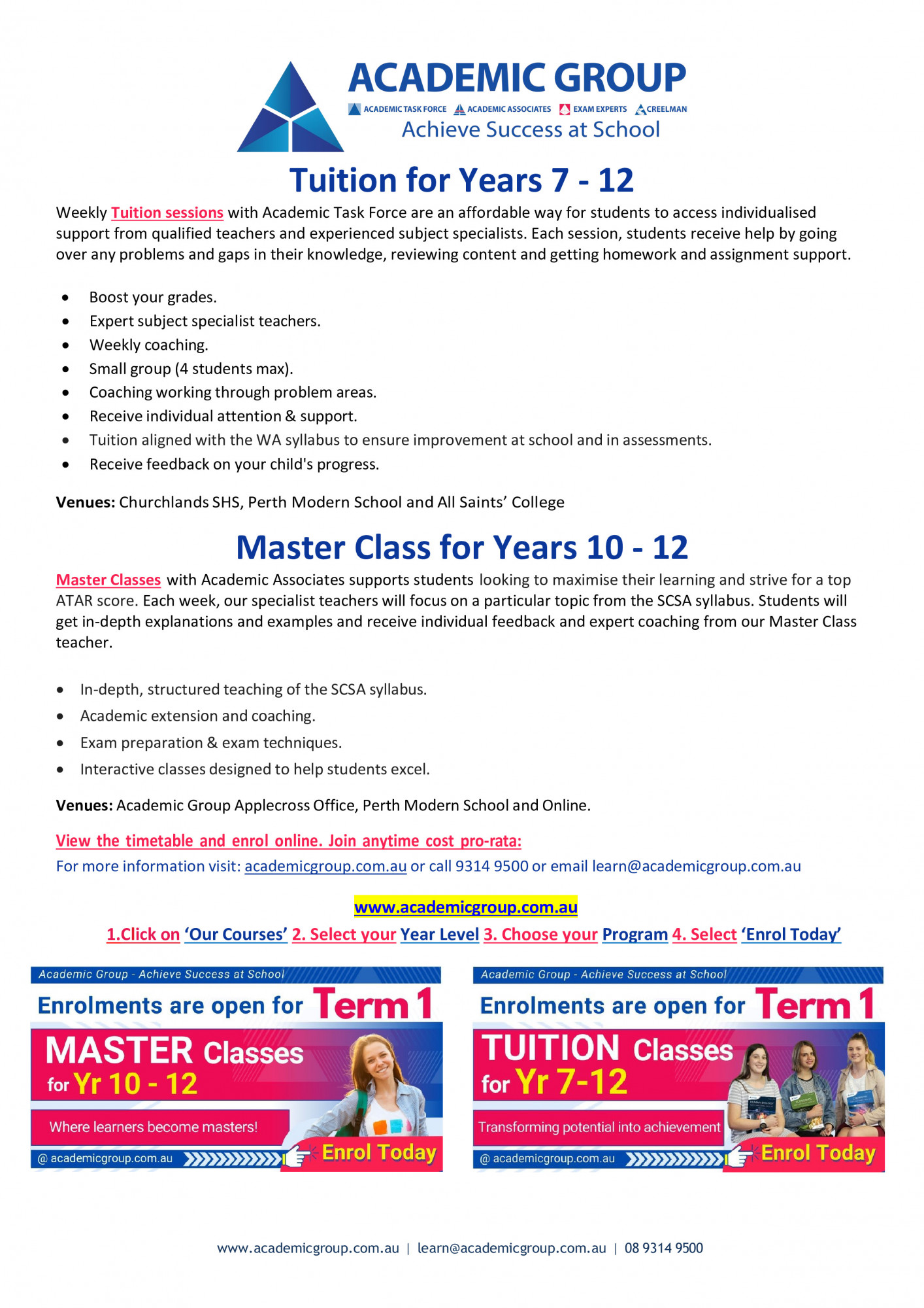 Please see below and linked information about Academic Group Term 1 – Tuition for Years 7 - 12 and Master Classes for Years 10, 11 and 12.