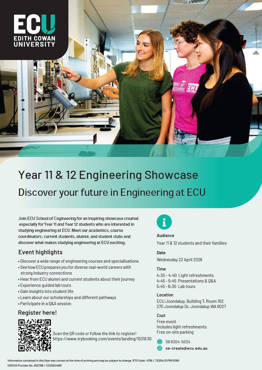 Join ECU School of Engineering for an inspiring showcase created especially for Year 11 and Year 12 students who are interested in studying engineering. Meet our academics, course coordinators, current students, alumni, and student clubs and discover what makes studying engineering at ECU rewarding and exciting.
