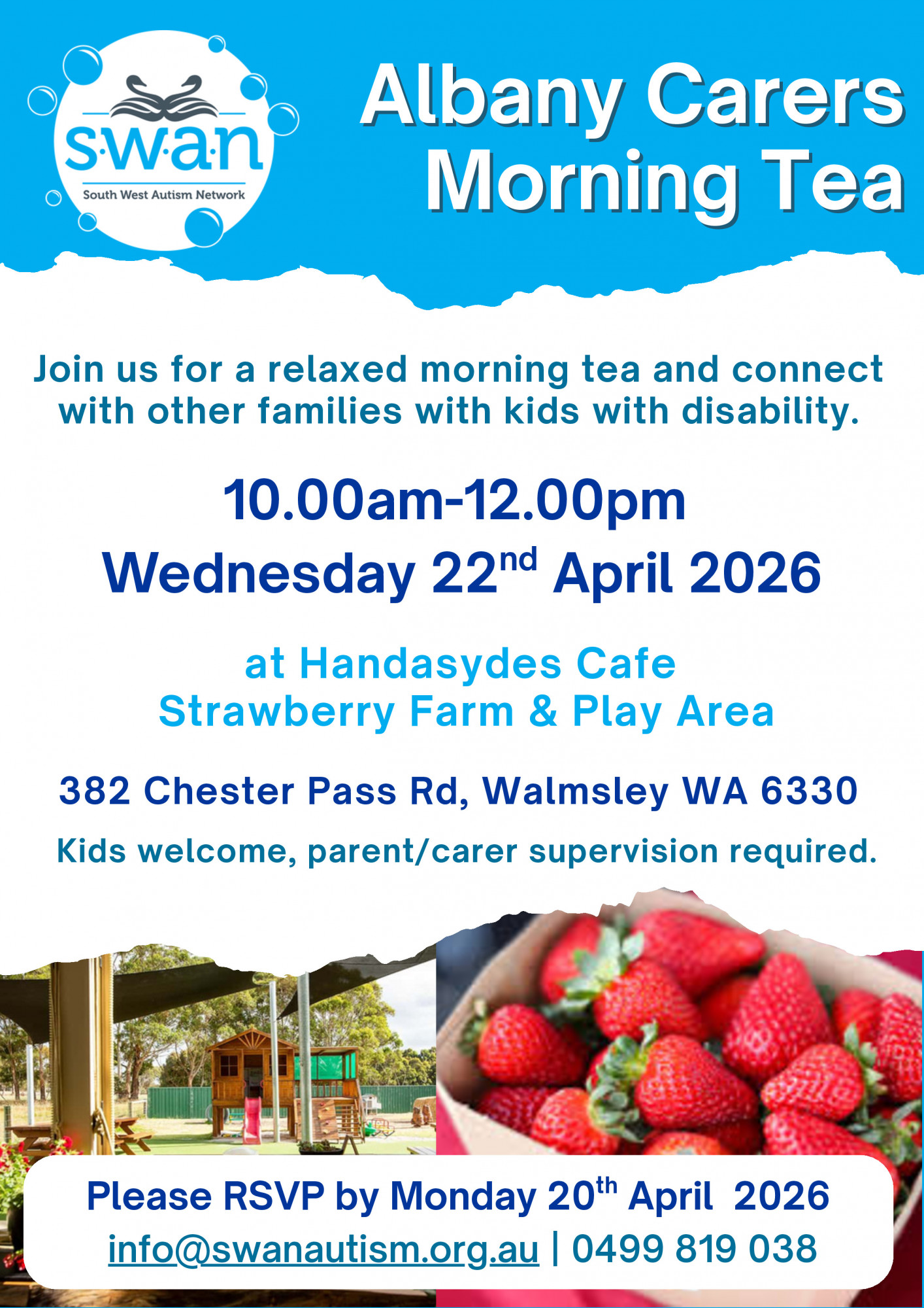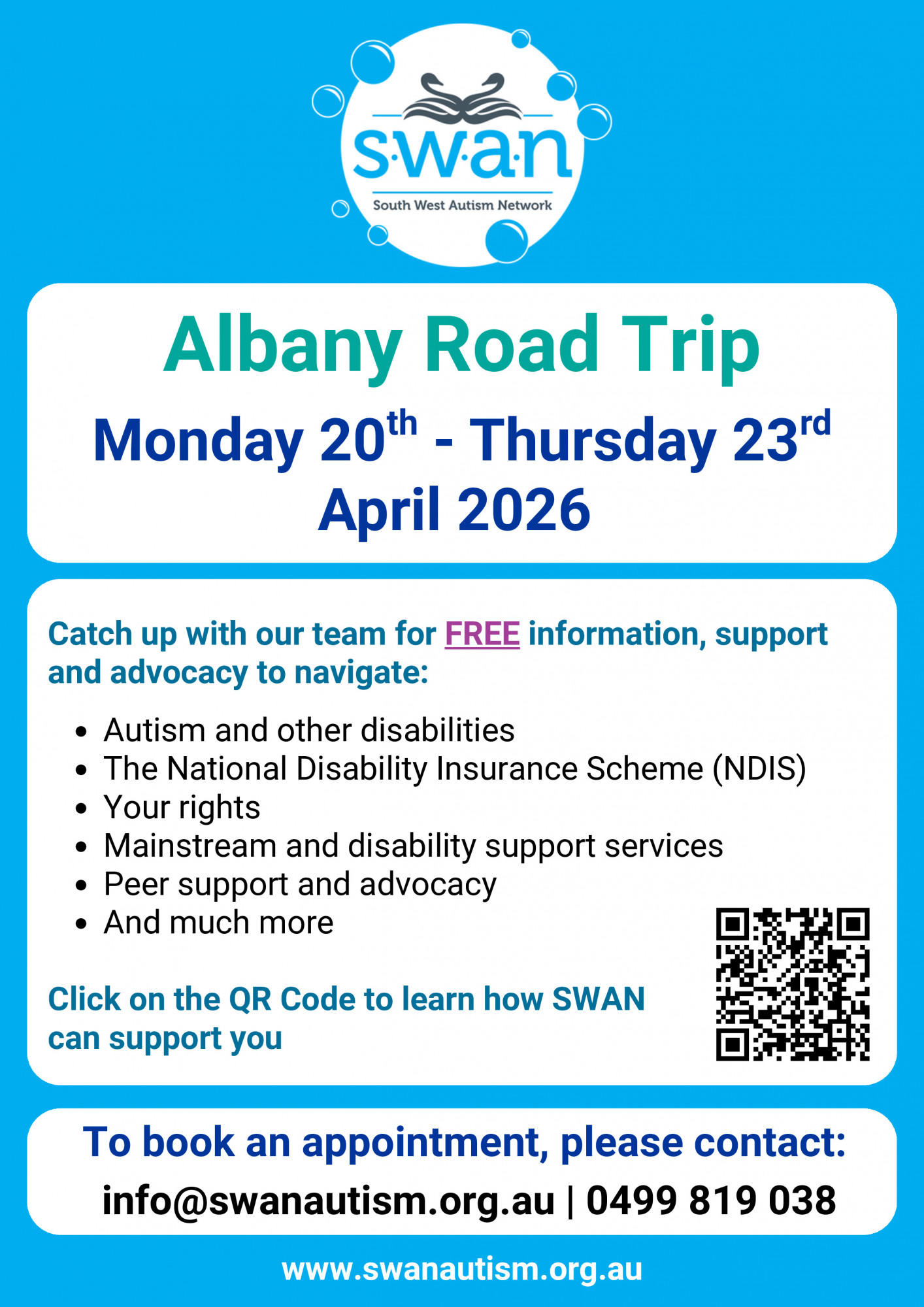 The SWAN team will be in Albany 20th-24th April 2026 and will be available to meet with people with disability, family members, and professionals.