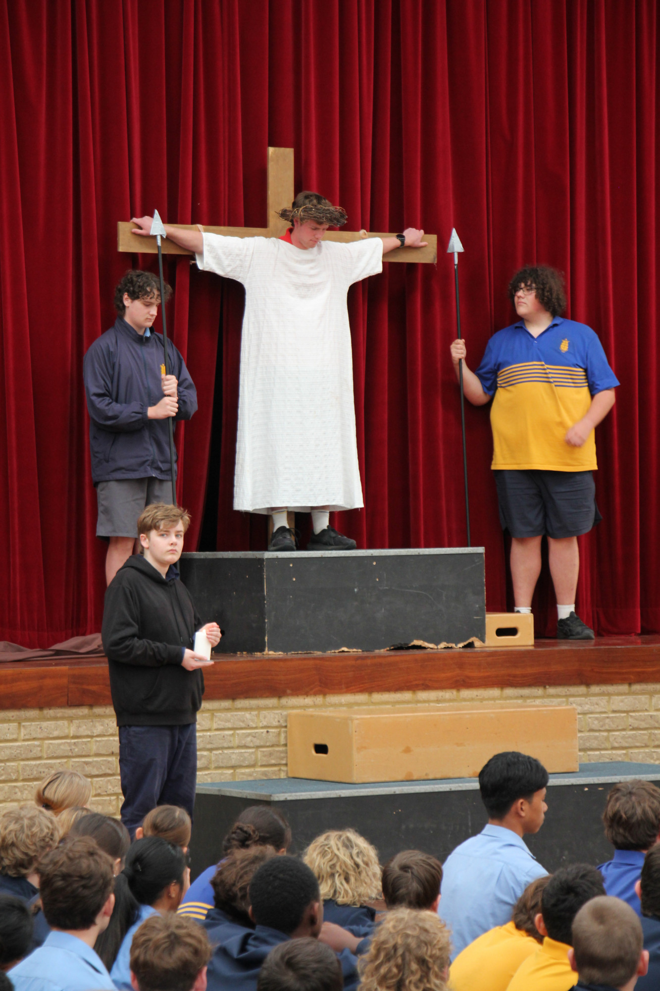 The presentation was brought to life by our Year 11 students, who took on the responsibility of recreating the story with reverence and maturity. Their thoughtful performances guided the audience through the significant moments of Jesus’ Passion, encouraging all present to consider the themes of sacrifice, compassion, and hope that lie at the heart of the Easter message.