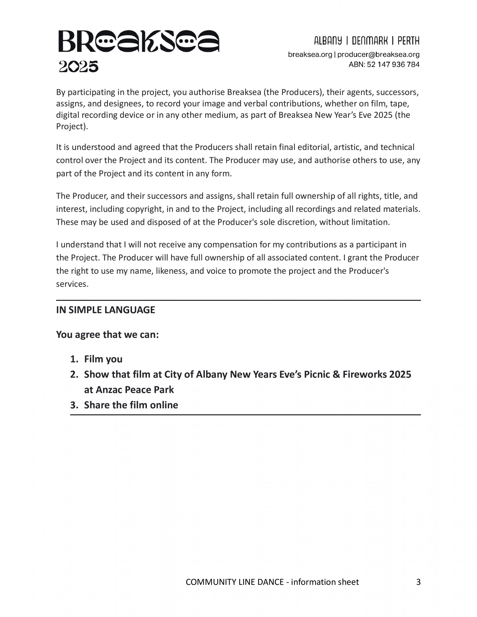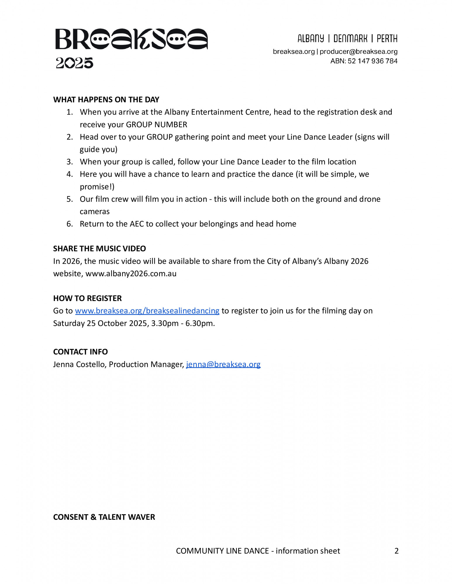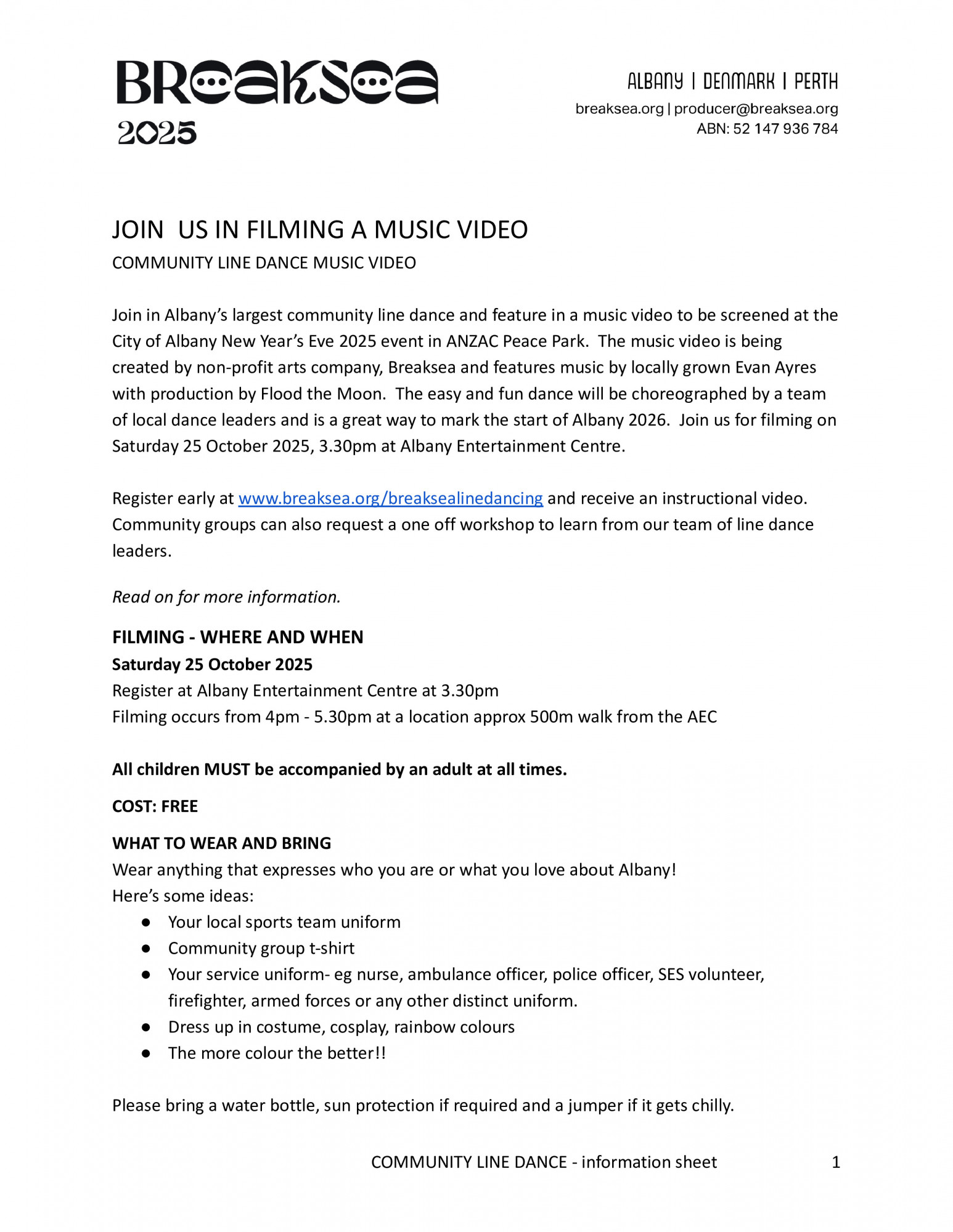 Breaksea, a non-profit arts company, is seeking 100s of people to join in Albany's biggest line dance on Saturday 25 October, 3.30pm - 5.30pm.