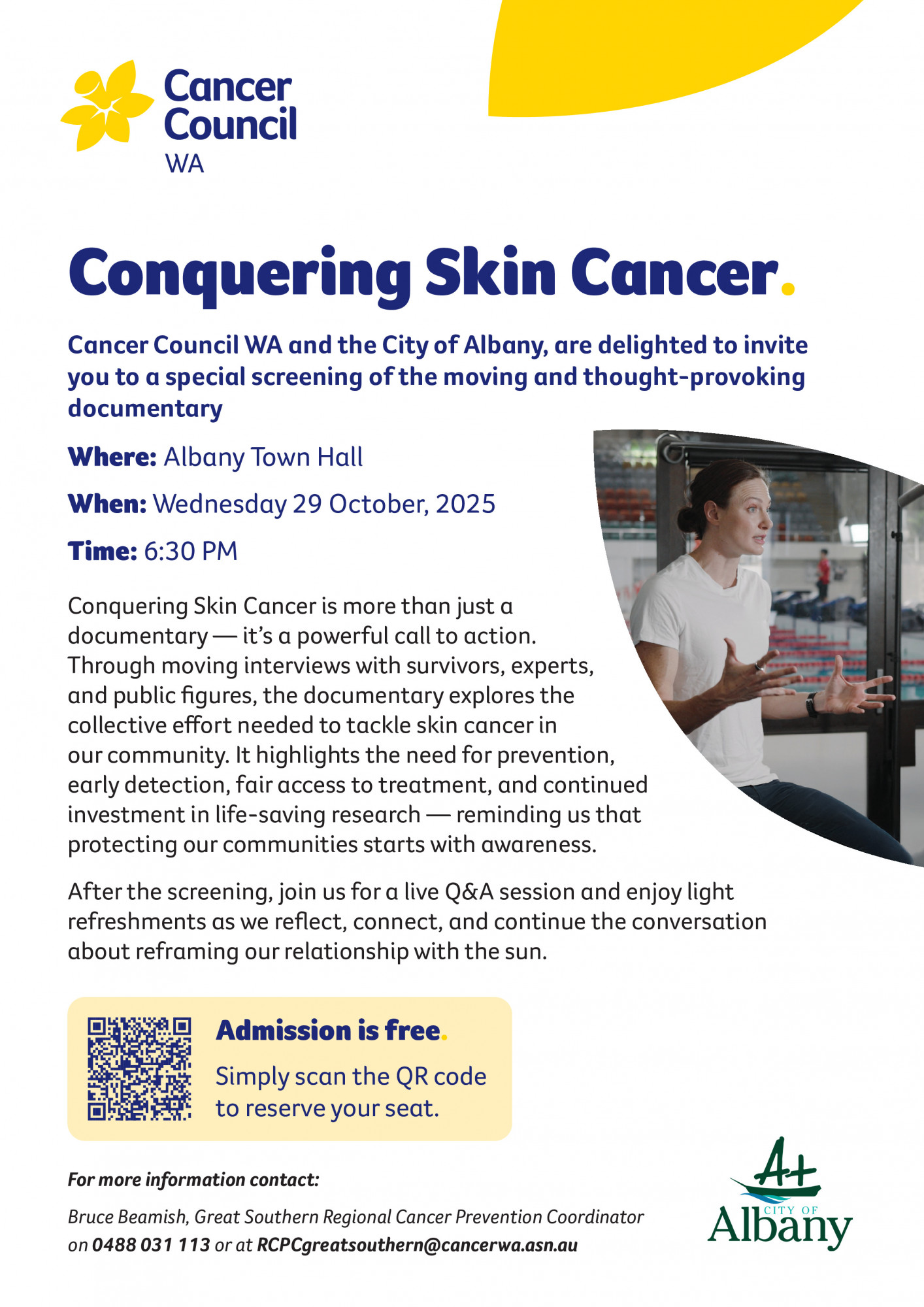 Cancer Council WA invites you to a special screening of a new feature-length documentary, Conquering Skin Cancer, which aims to spotlight the importance of skin cancer prevention, early diagnosis, in addition to the incredible advances in skin cancer treatment.
