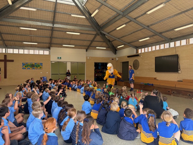 On Wednesday 11th March our Pre-Primary, Year One, Two and Three students participated in a presentation by Rick the Rock Eagle and his friend Brad. They learnt about being a good friend and that friends appreciate each other, are honest and are trustworthy. Brad, with the help of Rick the Rock Eagle and some student helpers, demonstrated how important it is to look after our friends and to be good to one another. After the presentation the Year One students took part in a skills workshop where they tried out some AFL skills such as handballing and kicking.