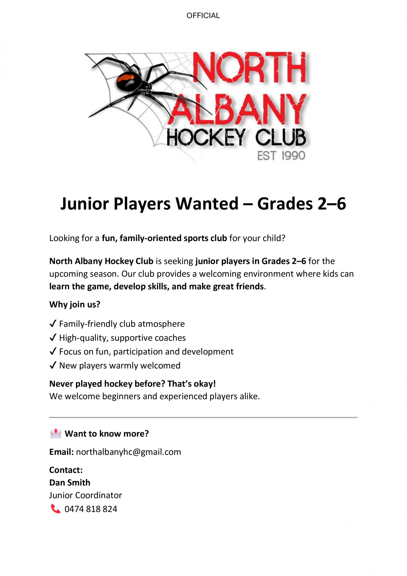 Spencer Park Hockey Club are looking for new junior players for the upcoming hockey season.