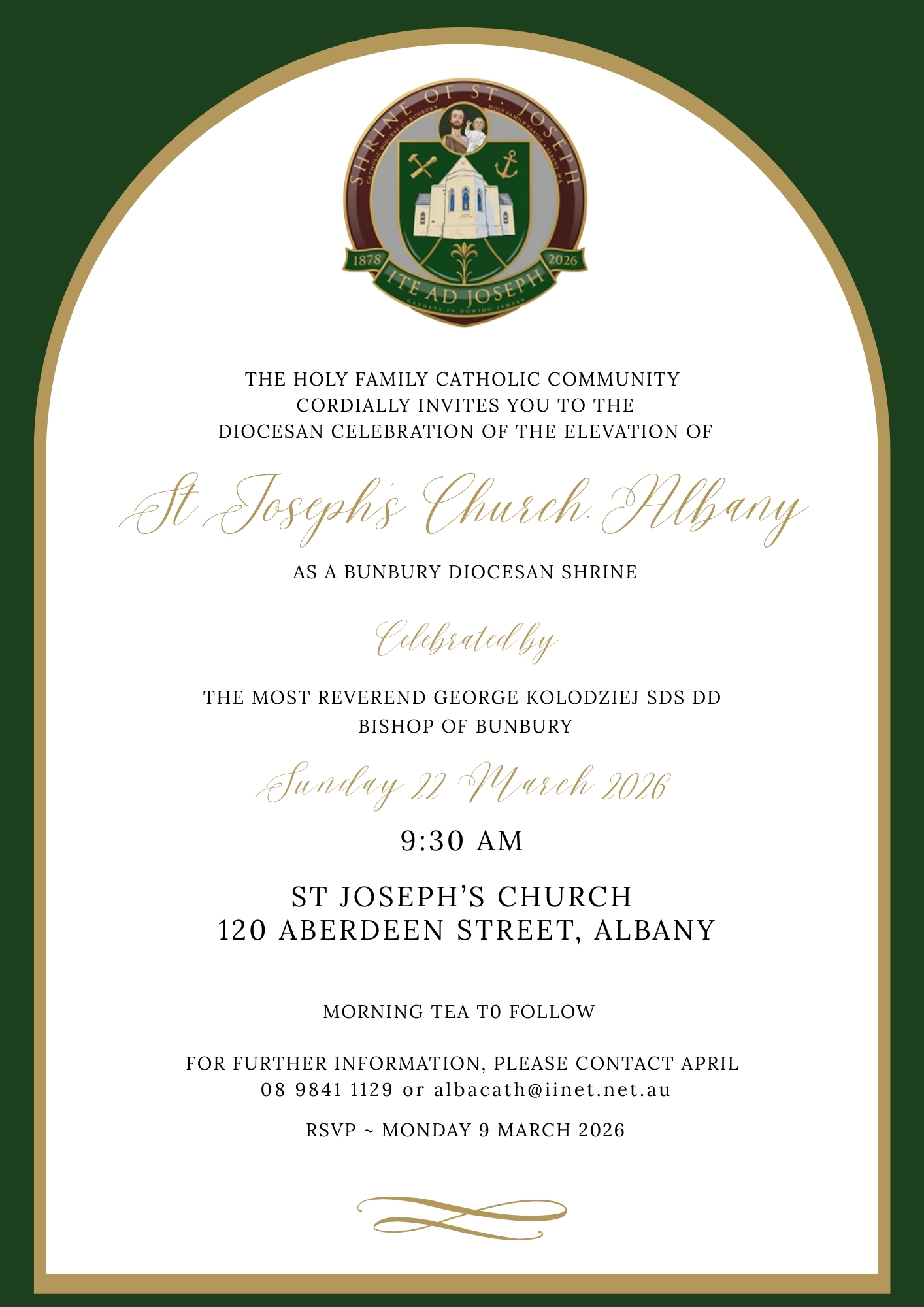 On behalf of the Holy Family Parish, you are warmly invited you to the elevation of St Joseph's Church to a Shrine in honour of the great Saint whom our College is named after.