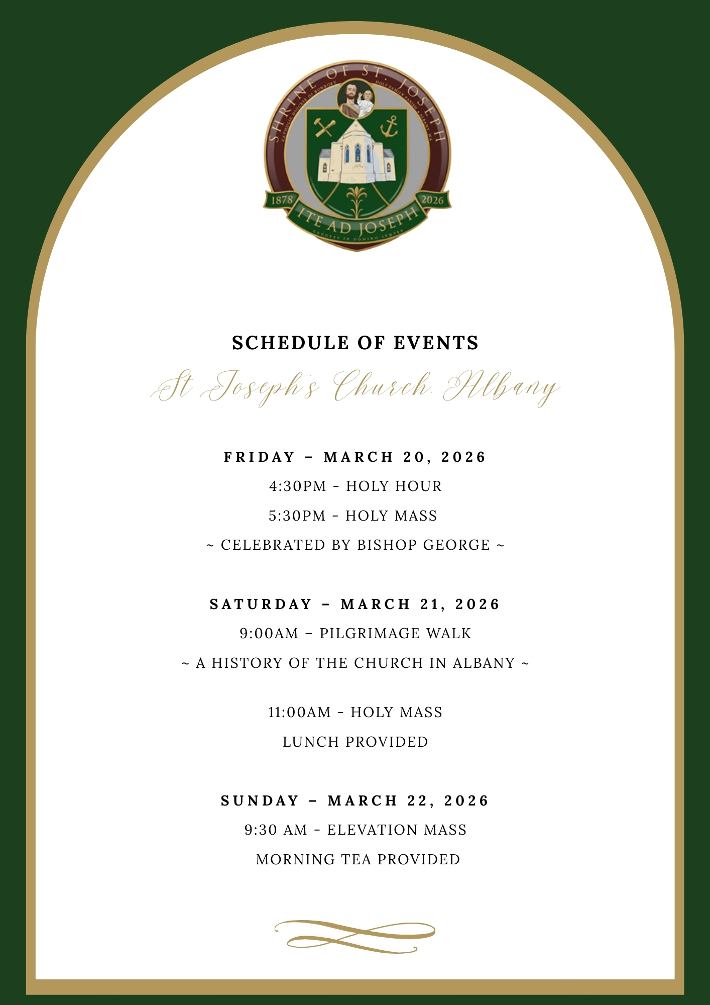 Please find attached the schedule of events for the special weekend celebrated by Bishop George of Bunbury and we hope that you can join us for this very special day for our parish and college community.