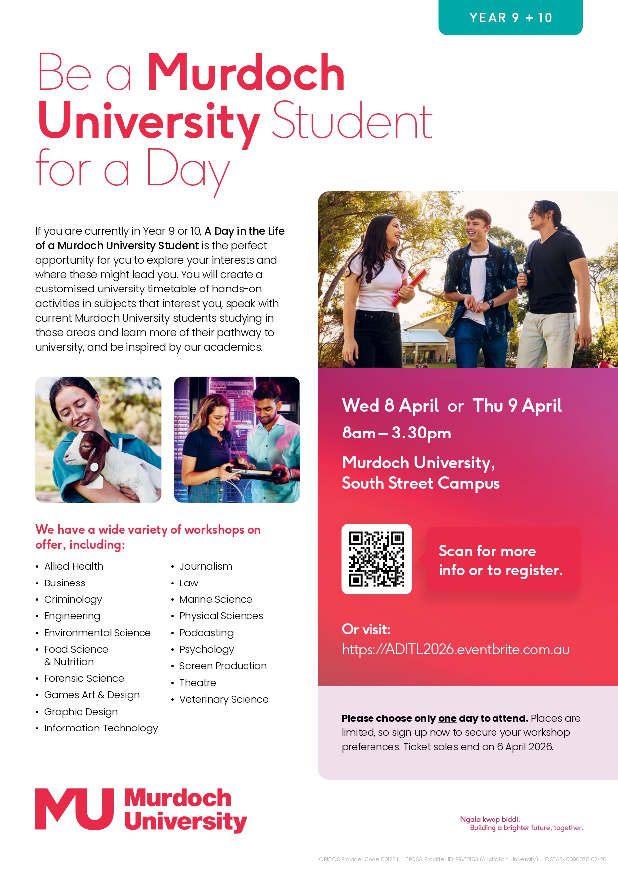 Students can step into real classes, meet our academics, and current Murdoch students, and get a feel for the courses and careers that inspire them. With interactive workshops, campus tours, and plenty of time for questions, it’s the perfect way for young people to discover their strengths, interests, and future pathways. Registrations are now open; student only need to register for one day — encourage your students to secure their spot and experience Murdoch for themselves!