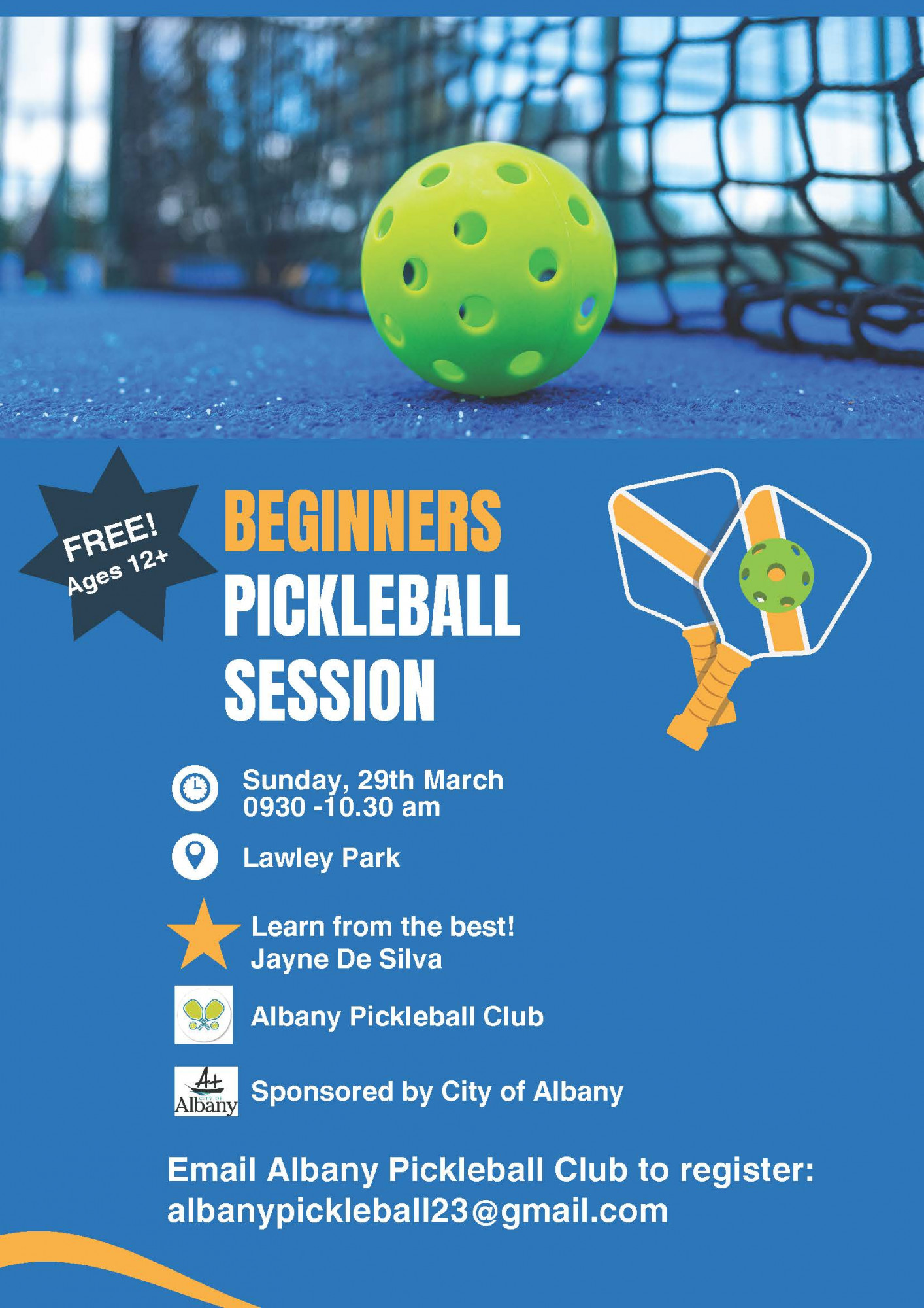Albany Pickleball Club are running it, City is sponsoring. Could be good PD. It’s being run by Jayne De Silva who is an ex Pickleball Champion & who has played at the highest level.